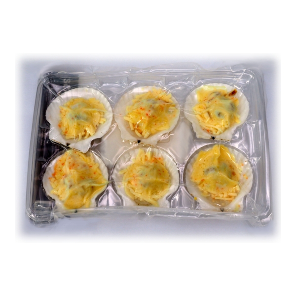 Conveniently prepared for you, this half shell scallop is covered with cheese and corn for your enjoyment. You can grill it over a BBQ fire directly, or wrap in foil and steam cook over the grill. Choose whichever way according to your taste preference.